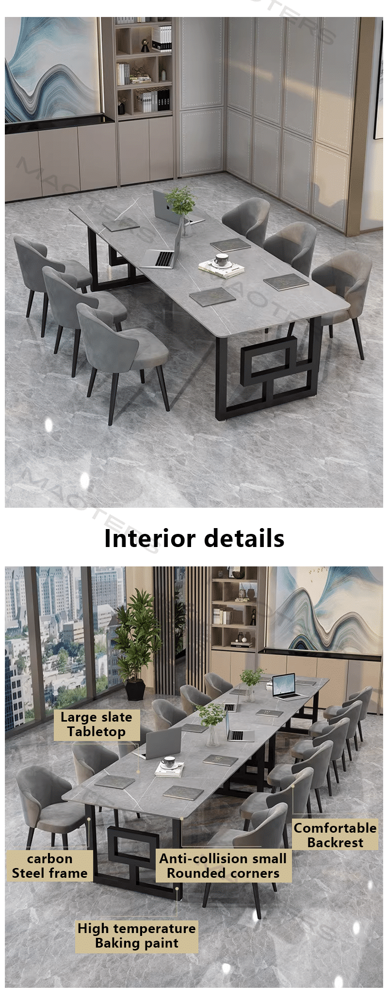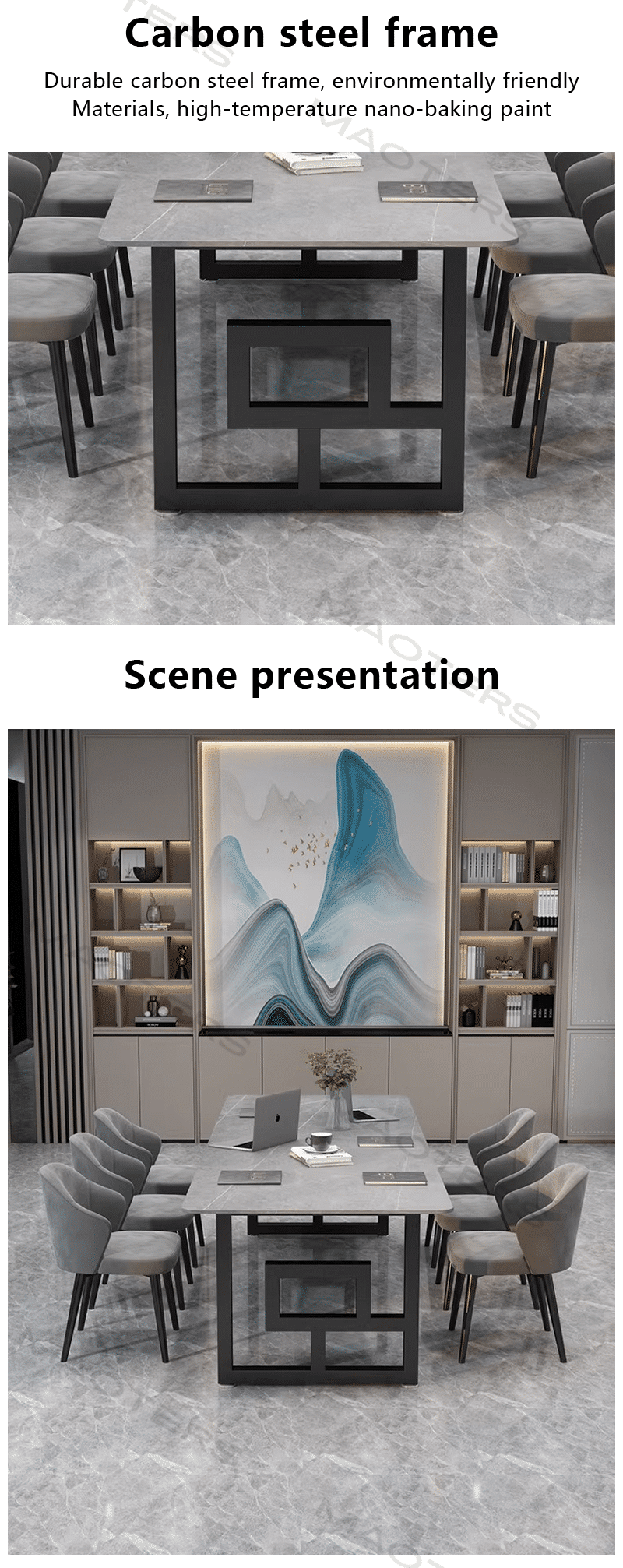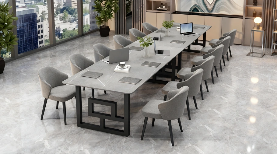 Combining Nordic minimalist aesthetics with the timeless charm of natural stone, this conference table features a smooth, smooth top made from a single piece of premium marble, paired with a cool stainless steel or warm wood base, creating a luxurious aesthetic that blends strength and softness. The tabletop retains the marble’s natural landscape pattern, each texture a unique artistic imprint. The surface undergoes a nano-level sealing treatment, making it impermeable and scratch-resistant, requiring only a simple wipe for daily maintenance. Functionally, the concealed cable duct system and liftable power module meet the digital needs of modern meetings. The rounded chamfers and ergonomically designed edge thickness ensure comfortable seating for extended meetings. Optional integrated wireless charging and a recessed conference tablet slot seamlessly blend technology with natural aesthetics. Suitable for executive conference rooms, design studios, high-end commercial showrooms, and other spaces, it can serve as a decision-making hub for business negotiations or as an art display to enhance the space’s style. Complemented with matching sideboards and storage components from the same series, it creates a unified and harmonious Nordic-inspired office environment. This conference table supports customized sizes, marble patterns and base materials, providing companies with exclusive space solutions, allowing rational office work and artistic atmosphere to complement each other.