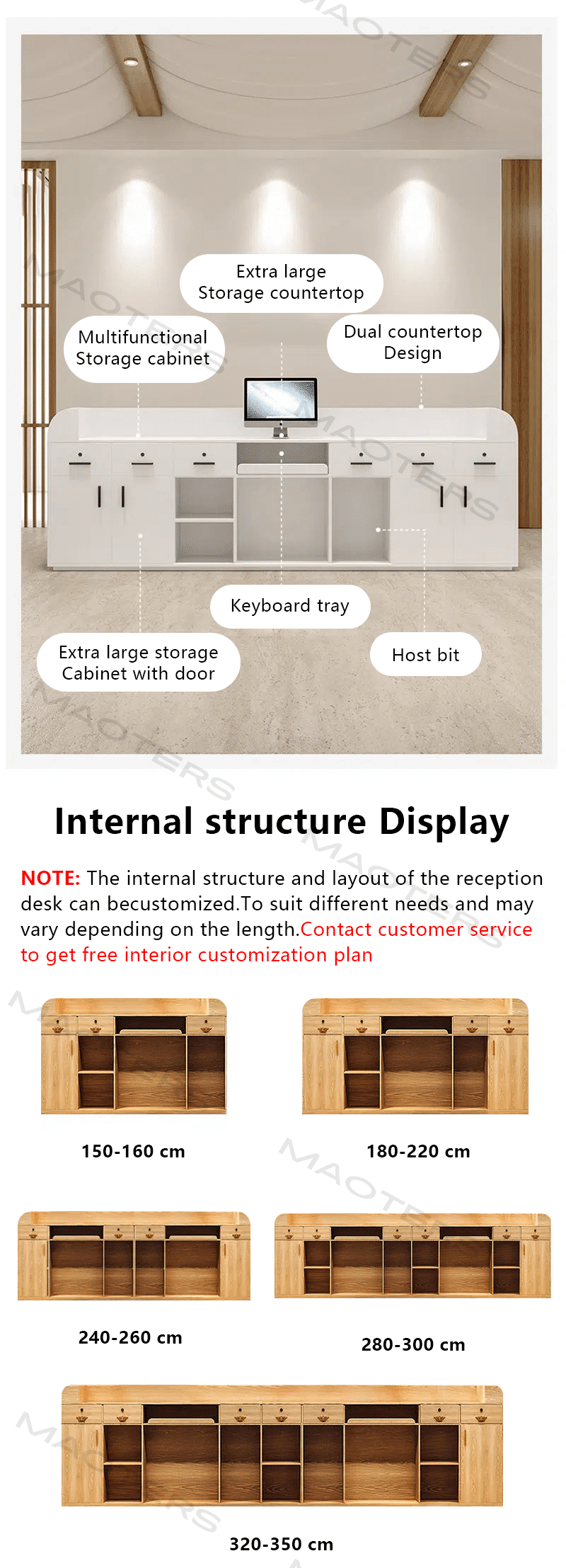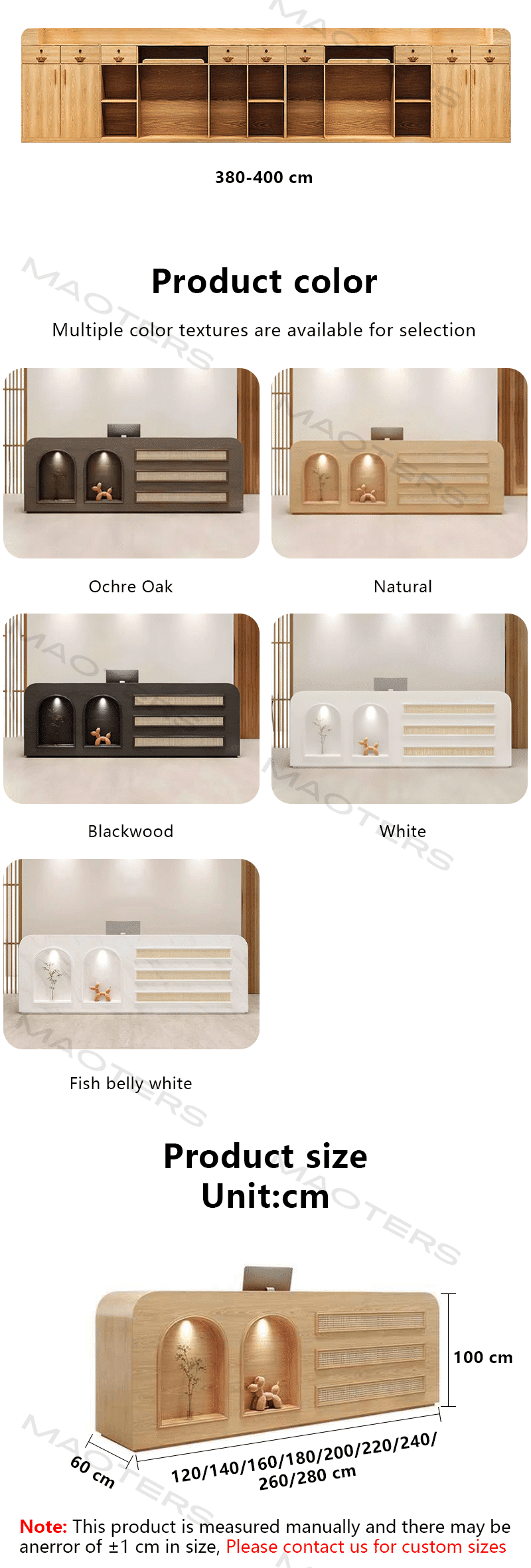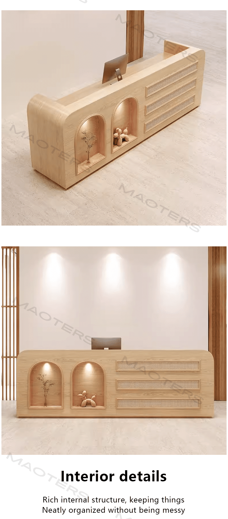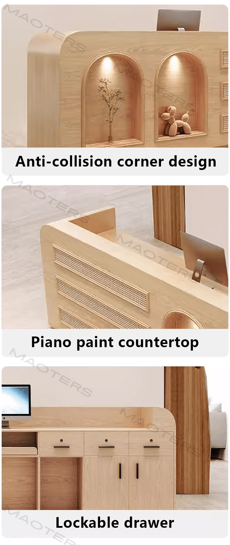 • Design and CraftsmanshipHigh-gloss finish, ultimate luxury: The tabletop is crafted with premium high-gloss piano lacquer, resulting in a smooth, deep, mirror-like sheen. Every reflection of light and shadow embodies the simplicity and elegance of modernism, effortlessly enhancing the quality of the space.Smooth curves, gentle welcome: Breaking the barriers of right angles, the reception table’s gentle curves outline the bar. This is not only a visual delight, but also a warm welcome, making every guest feel like they are being welcomed. Exquisite construction, stable and reliable: We pay attention to every detail. The sturdy metal frame or high-quality wooden base ensures the table’s stability and durability. The hidden cable management system eliminates clutter and maintains a consistently neat and professional workspace.
