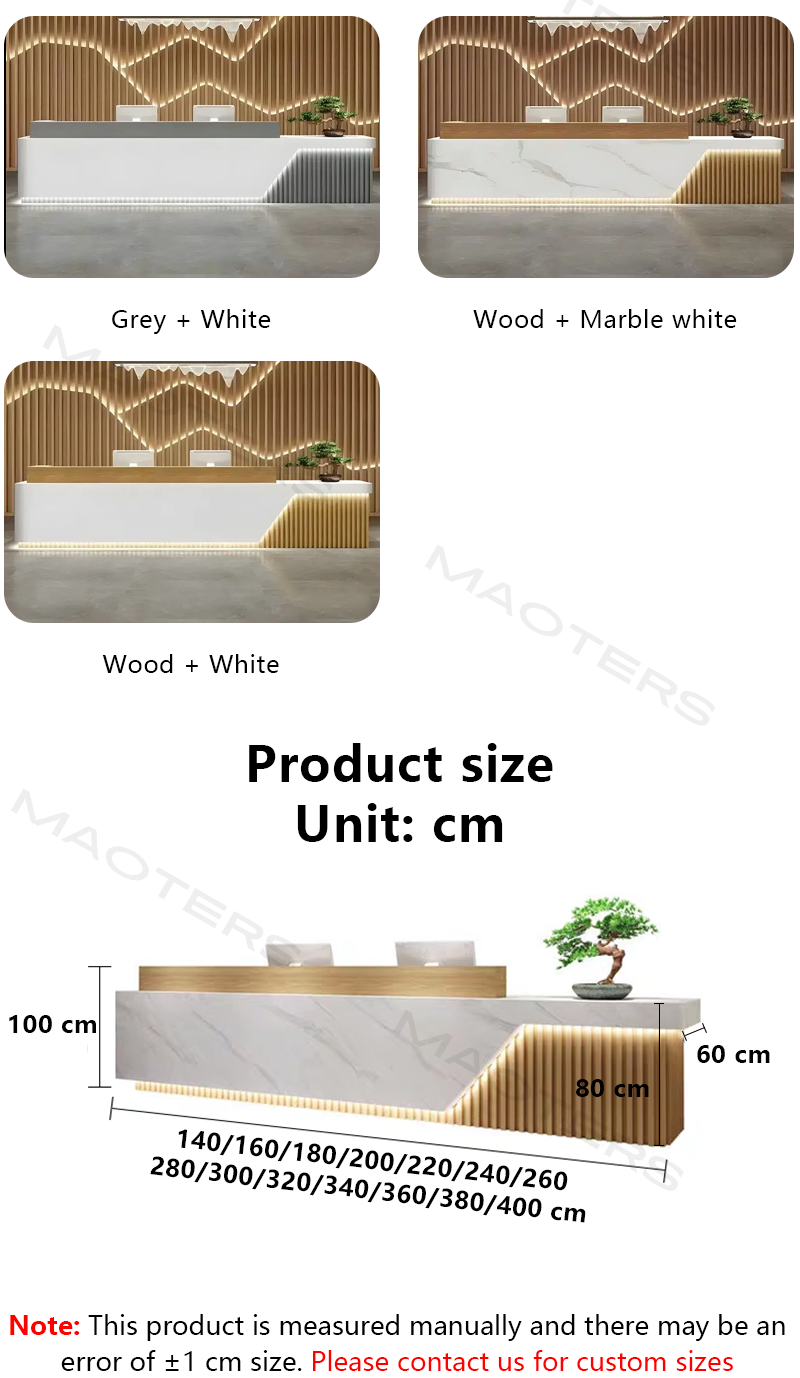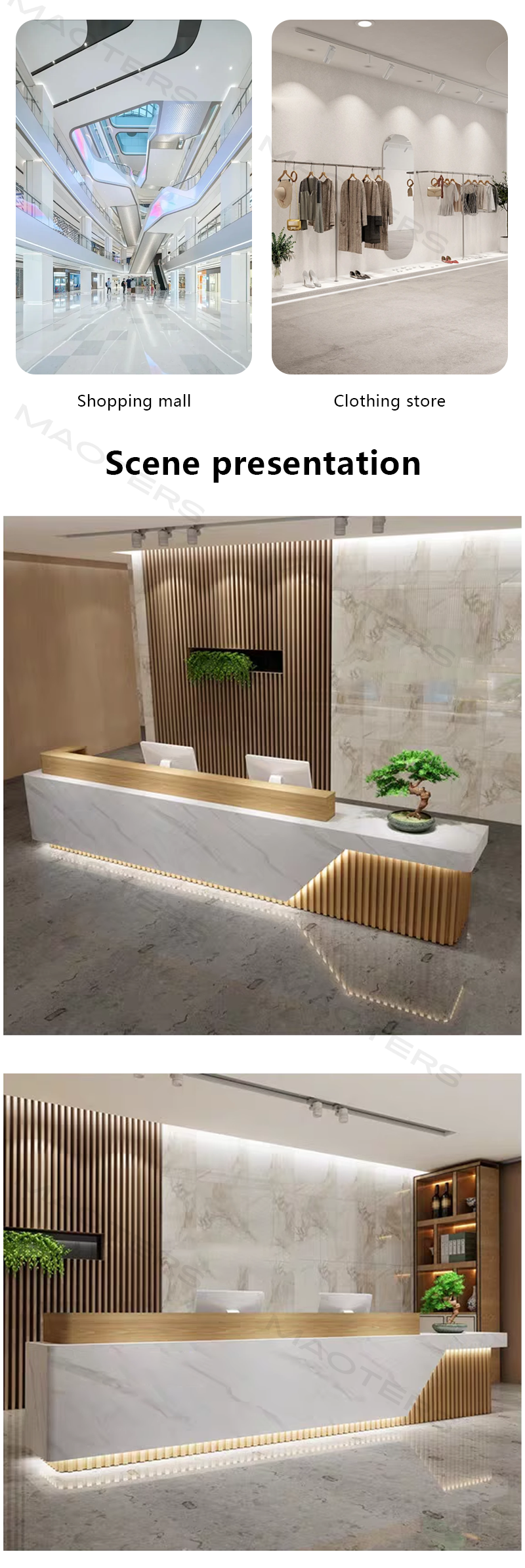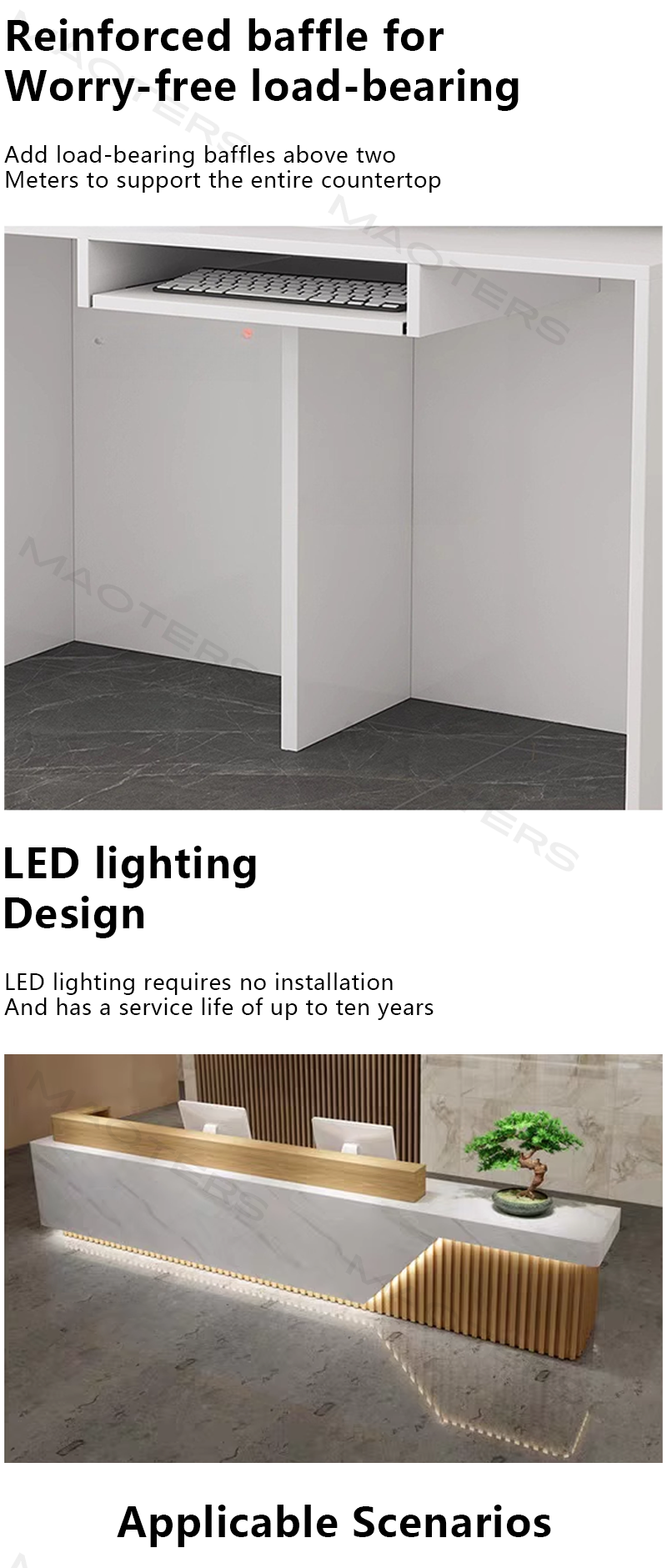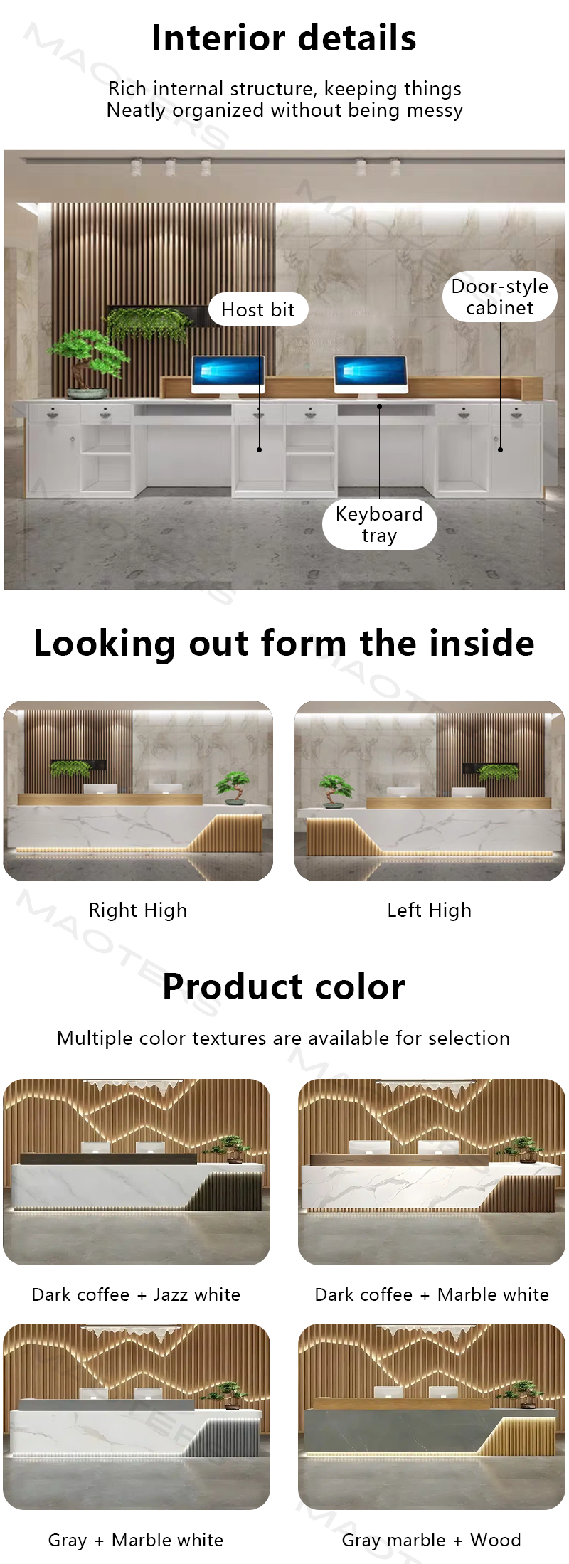 The front desk is a visitor’s first impression of your company. Our commercial reception desks are designed to create a professional,  modern aesthetics, and practical functionality. Made of high-strength commercial-grade wood with a hard-wearing finish, these desks easily withstand the rigors of daily use. Their elegant,  from the modern feel of a tech company to the professionalism of a law firm. Understanding the demands of receptionists, we’ve designed user-friendly interior space and cable management systems to keep the desk neat and organized. The spacious surface provides ample space for visitor registration and document processing. Choosing our commercial reception desks is more than just a piece of furniture; it’s an investment in enhancing your brand image and productivity. Professional and Durable: Commercial-grade construction offers strong load-bearing capacity, scratch-resistant performance, and durability. Modern Design: Clean lines and a variety of styles enhance the style of your office space. Practical and Functional: Built-in cable management and ample storage keep your workspace tidy and efficient.
