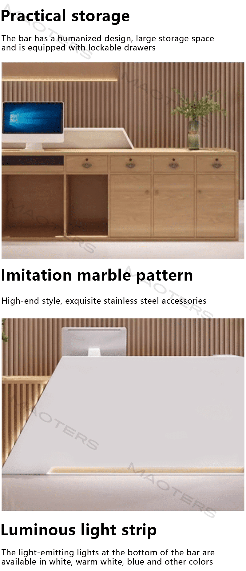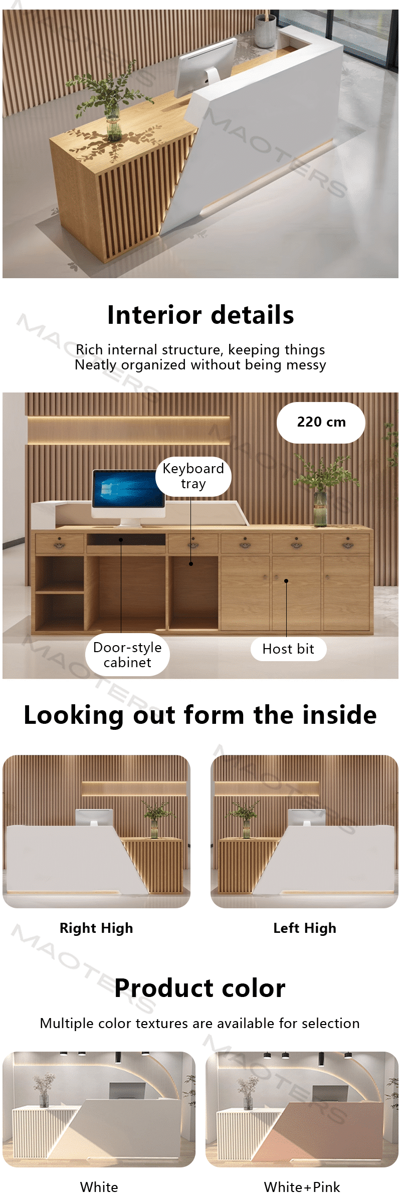 Our branded, influencer-inspired reception desk seamlessly blends innovative design with personalized branding for a bold visual impact. Transform your reception area into a vibrant brand experience, crafted from premium materials for an instant visual impact that showcases your brand’s unique personality. This desk seamlessly integrates form and function, seamlessly incorporating various technologies, including built-in LED lighting to enhance your brand image and thoughtful cable management for a clean aesthetic. Smart storage solutions and ergonomic workspaces combine practicality with style. Ample storage ensures efficient and convenient front desk staff, ensuring both aesthetics and practicality. Ideal for creative agencies, tech startups, and forward-thinking brands, this desk serves as both a functional hub and a powerful marketing tool. It creates a memorable first impression, transforming every visit into an opportunity to strengthen your brand story. Elevate your space with a desk that not only welcomes guests but also inspires them.